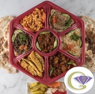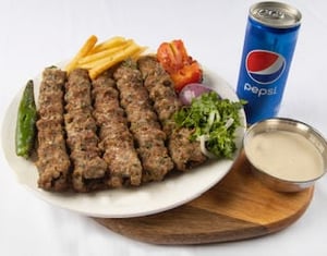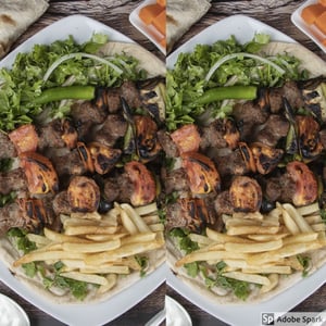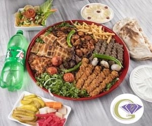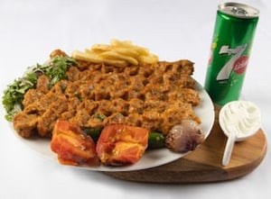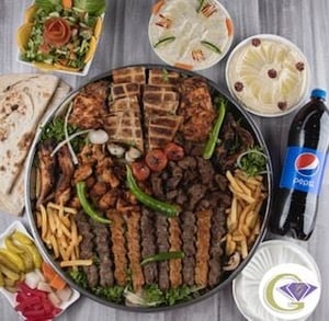Enough for 7 people. 4 tikka 4 tawook + 5 meat kebab + 5 chicken kebab + 1 arayes meat platter + 1.5 charcoal grilled chicken + 1 hummus + 1 mutabal + 1 salad + 1 garlic served with family Pepsi and spicy bread