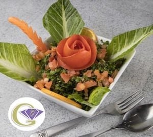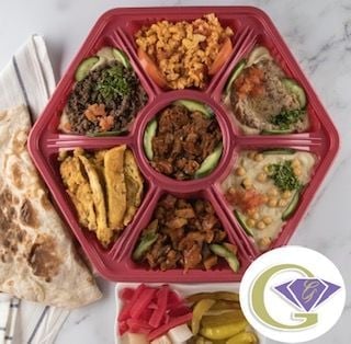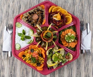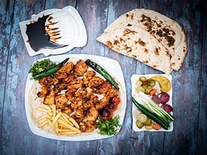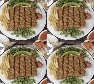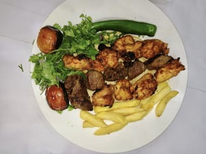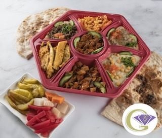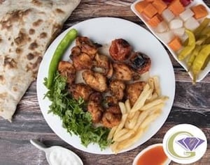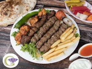Serves 10 people, 5 tikka, 5 shish tawook, 2 arayes, 6 meat kebab, 6 kebab. Chicken, 2 charcoal grilled chicken, 1 hummus, 1 mutabal, 1 salad, 1 fattoush, 1 . Garlic served with 2 family pebbles and spicy Iranian bread 1