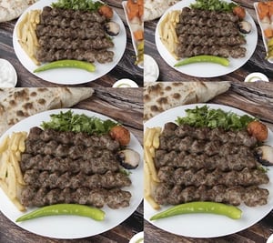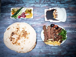 3 kebab skewer with bread + broth bowl + lentil bowl + lentil bowl + maabooch + spicy bread