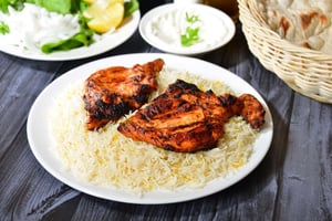 1/2 chicken on charcoal + chips + garlic + spicy bread