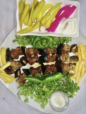 3 meat kebab with onions and tomatoes + garlic + spicy bread