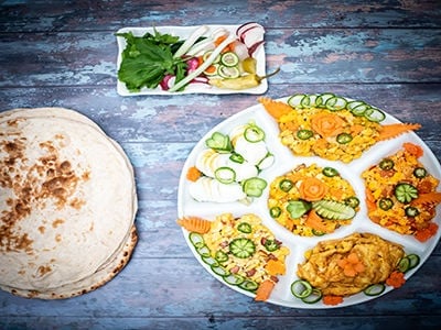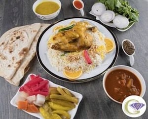 Chicken biryani + broth bowl + lentil bowl + maabooch + spicy bread