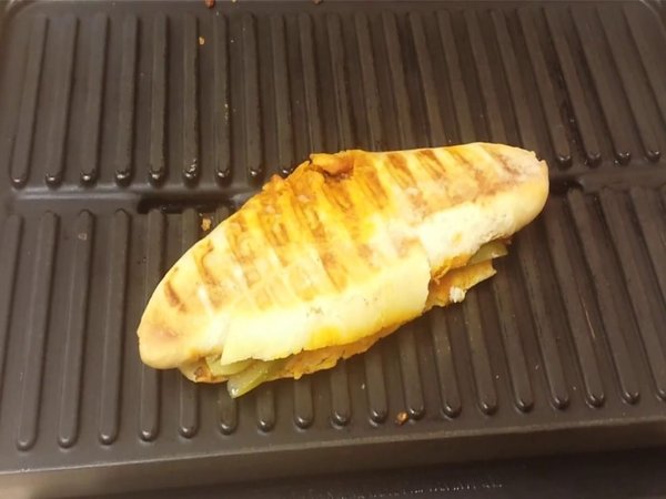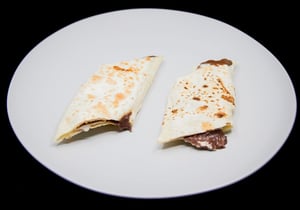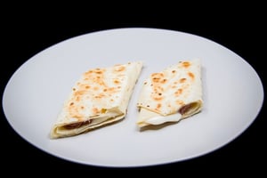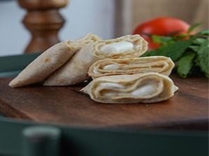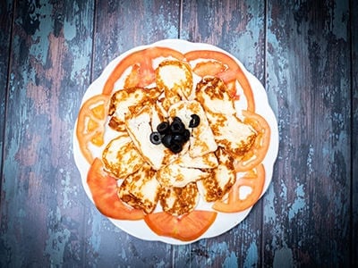 Saj bread with kraft, halloumi, thyme, tomatoes and olive slices