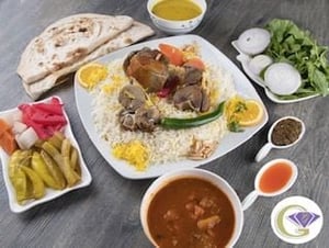 Meat biryani + broth bowl + lentil bowl + maabooch + spicy bread