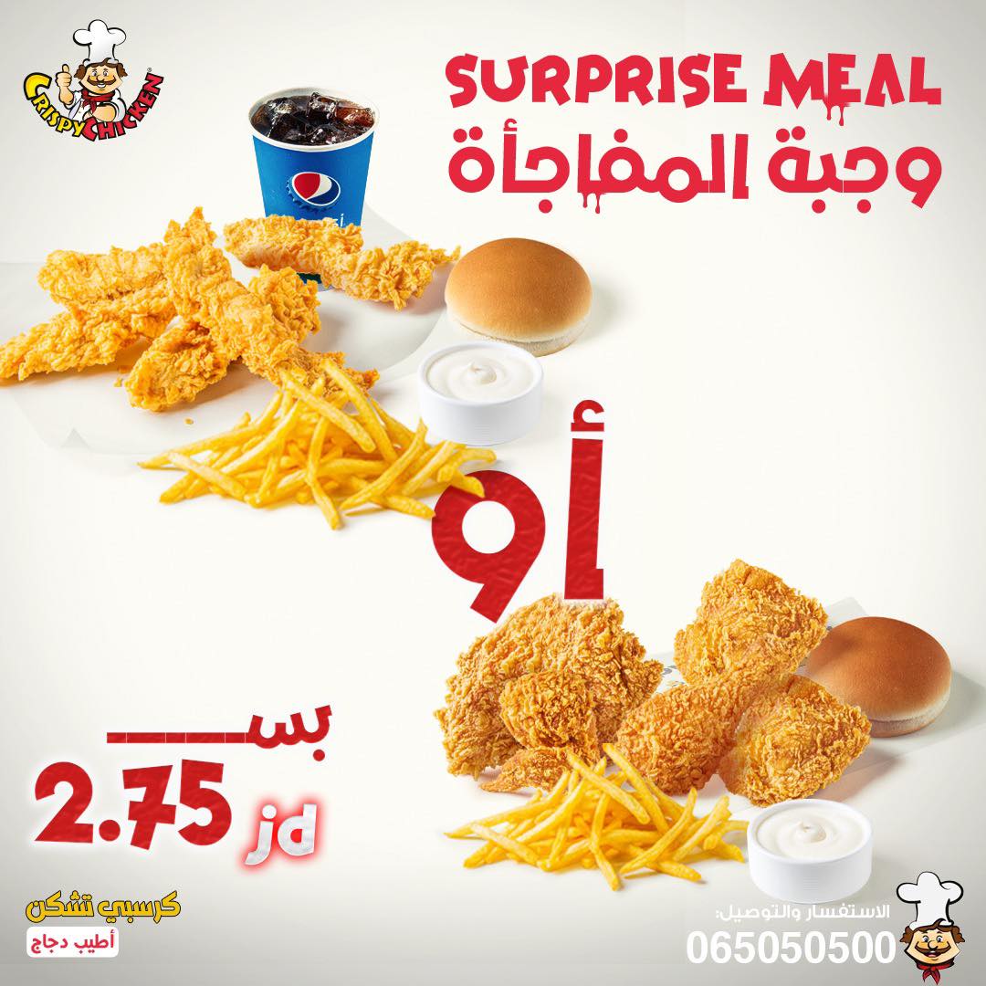 اختيارك من 4 قطع دجاج 1 بطاطا - 1 ثوم -1 خبز او 5 قطع كرسبي مع 1 بطاطا - 1 ثوم -1 خبز -1 بيبسي بس ب 2.75 دينار