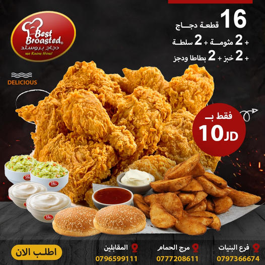 فقط بـ 10 دنانير 16 قطــع دجــاج + 2 مثومـة + 2 سلطة + 2 خبز + 2 بطاطا ودجز