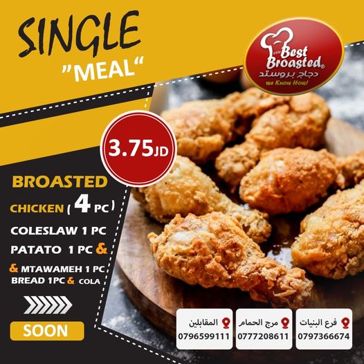 فقط بـ 3.75 دنانير 4 قطــع دجــاج + 1 مثومـة + 1 سلطة + 1 خبز + بطاطا + كولا