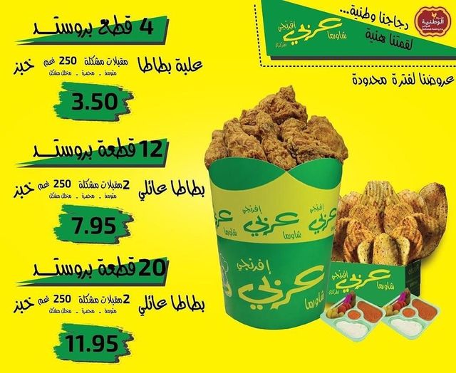 20 قطعة بروستد + بطاطا عائلي + 2 مقبلات مشكلة + خبز : فقط ب 11.95