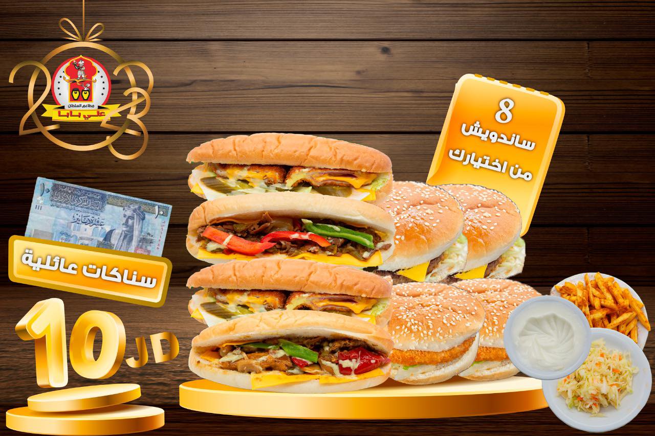 سناكات عائلية ( 8 ساندويش من اختيارك - زنجر - فاهيتا - تشيكن بيتزا - سكالوب - فيلادلفيا- برجر دجاج أو لحمة ) + 1 كولسلو + 1 مثومة + 1 بطاطا فقط ب 10 دينار