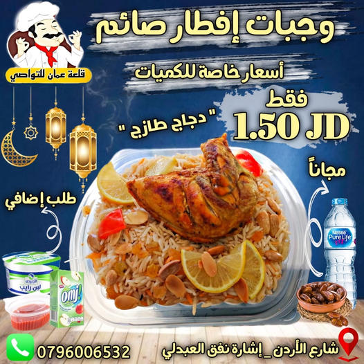 ولأنه شهر الخير رجعنالكم من جديد مع وجبات إفطار صائم بسعر مميز جدا : فقط 1.5 (دينار ونصف) مياه + تمر مجانا دجاج طازج