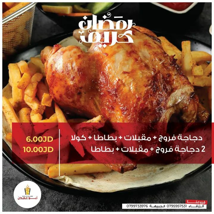 2 دجاجة فروج + مقبلات + بطاطا بسعر 10.00 دينار