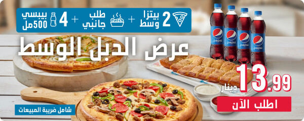 2 بيتزا وسط + طلب جانبي + 4 ببسي 500 مل 13.99 دينار